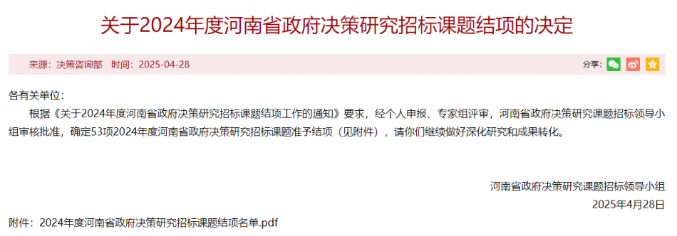 喜讯:我校1项2024年度河南省政府决策研究招标课题顺利结项